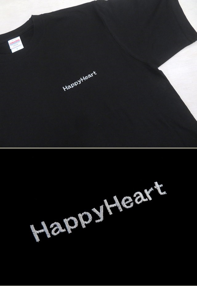 数ある種類の中から好みのTシャツを選び、左胸にフォントを指定して「HappyHeart」の文字を入れました。