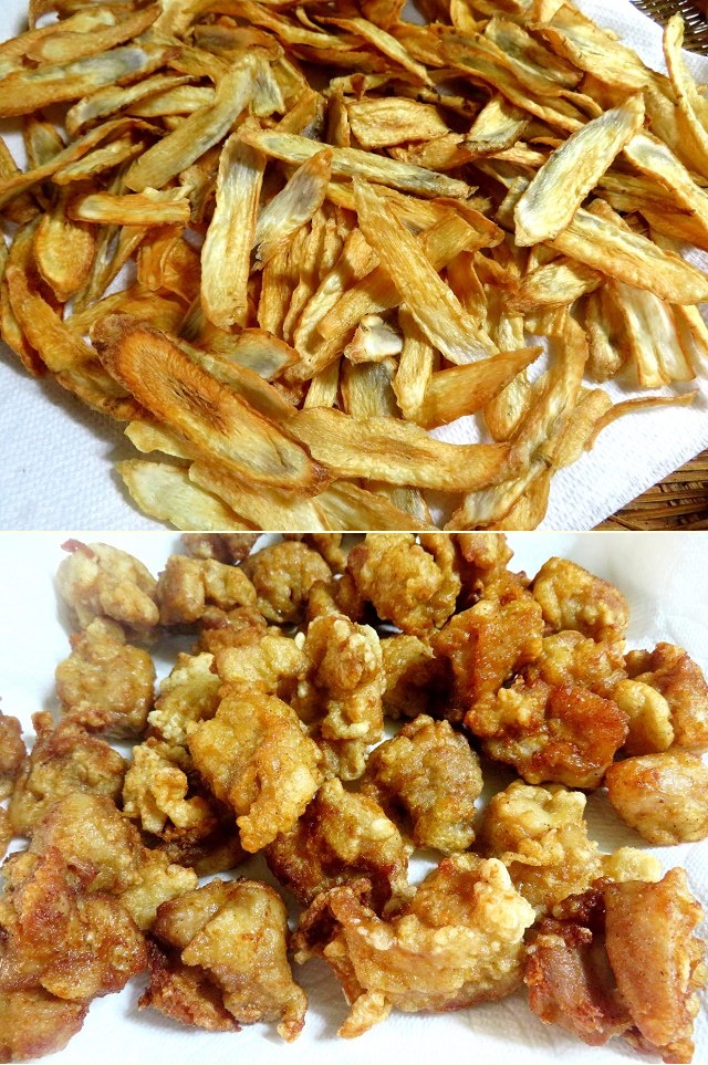 ポテトフライ(チップス)も美味しいけれど、塩コショウしたごぼうチップスも美味。