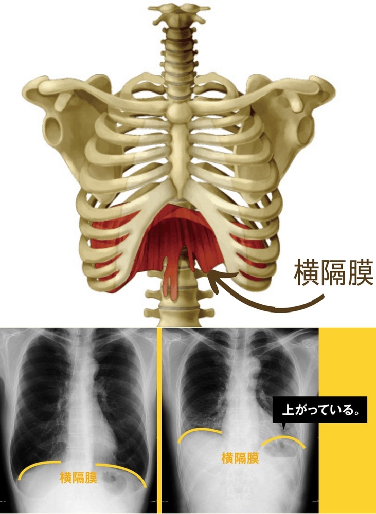 右は、空気を吐いたことで横隔膜が上がった。ということだろう。