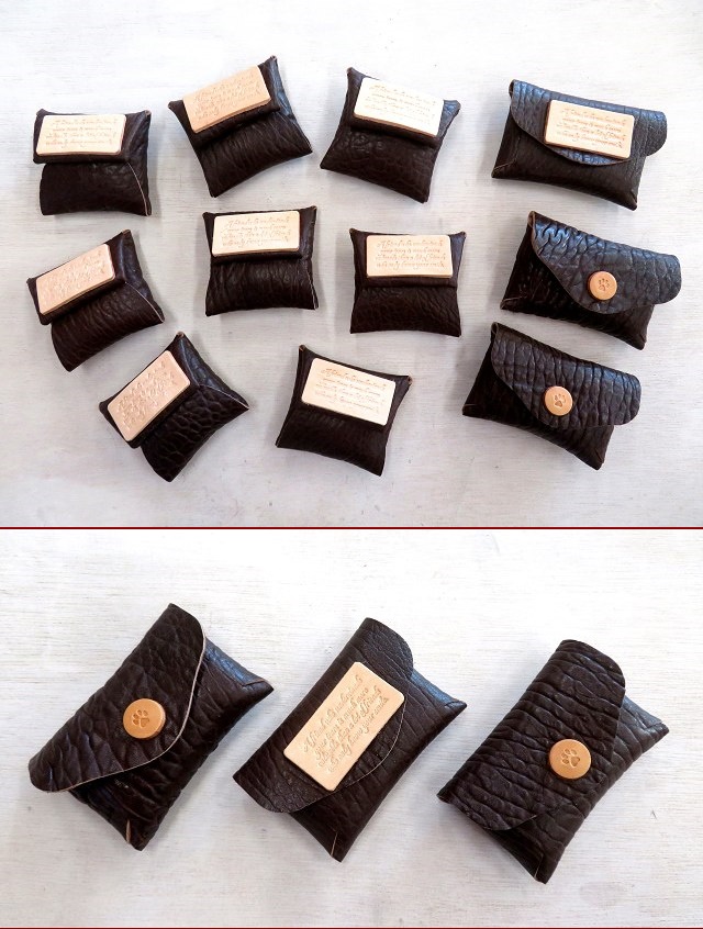 タグは、厚さ3mmのヌメ革を濡らし、プレス機にかけ、型抜きしたもの。
