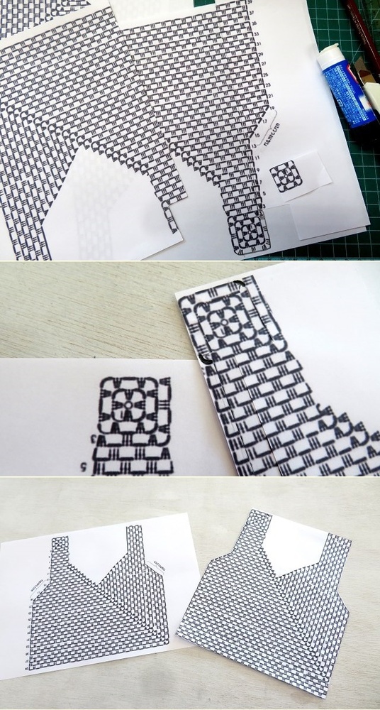 何枚もコピーを取り、切り張りして完成したのが画像下の右側の編み図です。