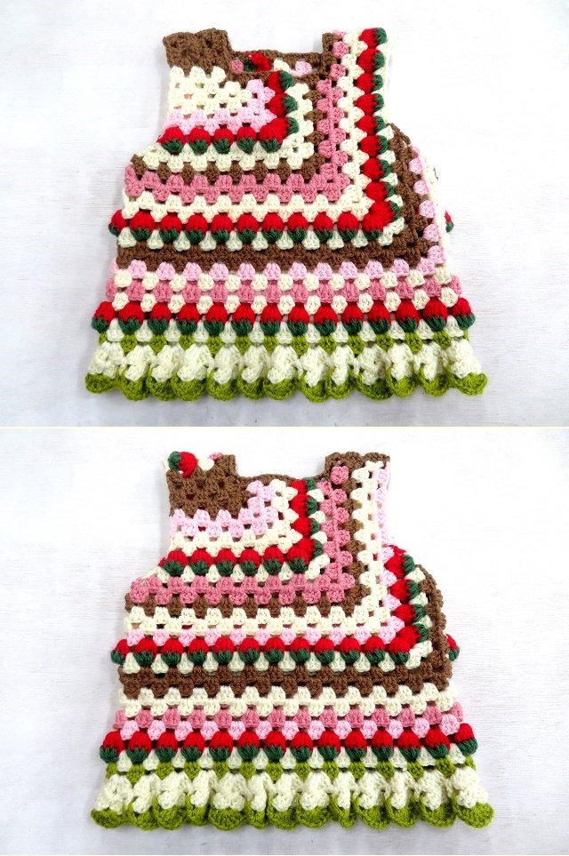 襟ぐりを裾と同じピスタチオクリームで編んだら、ちょっと主張が強すぎたので、淡いピンクの苺クリームにしてみました。