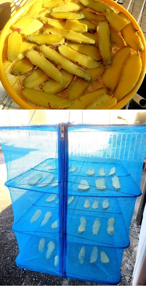 夜、蒸かし、粗熱が取れたら皮を剥き、スライスして干すスタンバイをしておきました。(画像上)