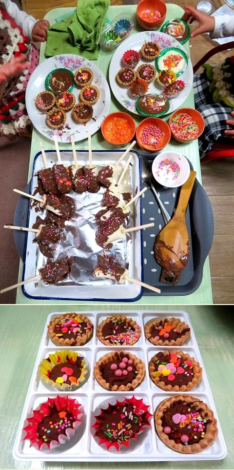 チョコをスプーンでタルト生地に入れたり、手際よく飾り付けしたり、とても上手に進めていました。
