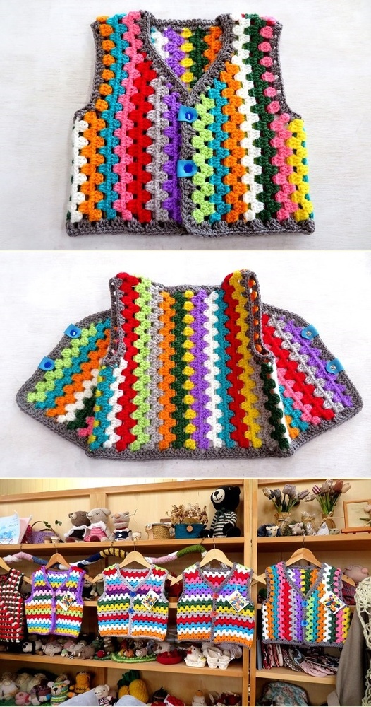 このベストでいうと、背中の真ん中の黄色から前身ごろにかけて、どんどん編んでいく感じ。