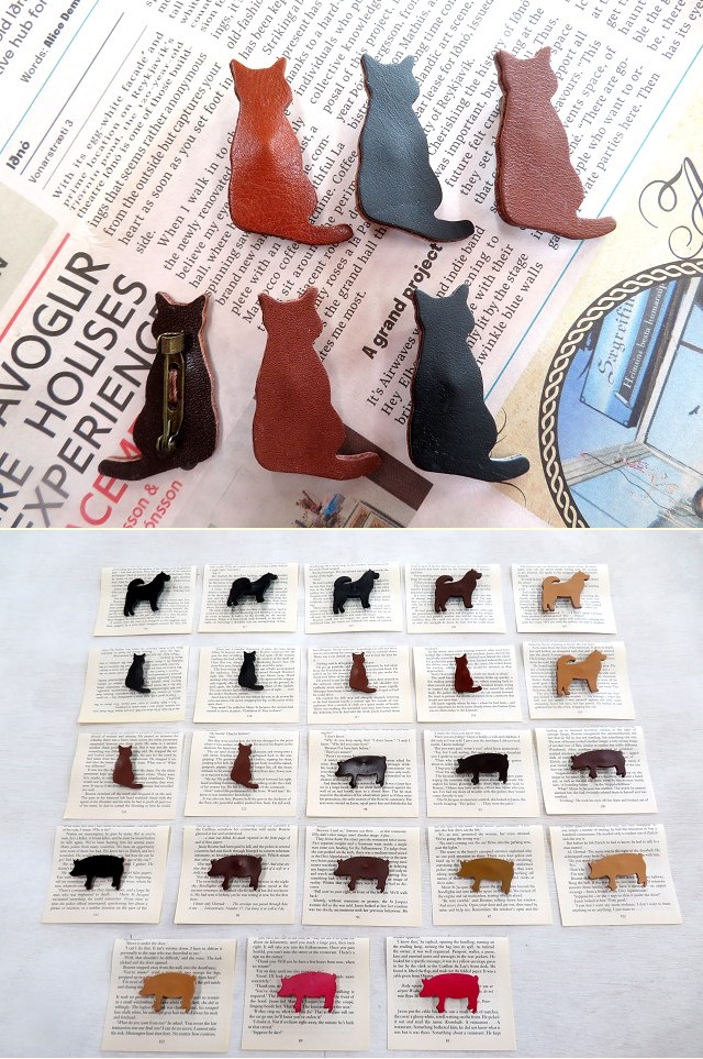 オイルレザーのネコとブタとイヌのブローチ。
