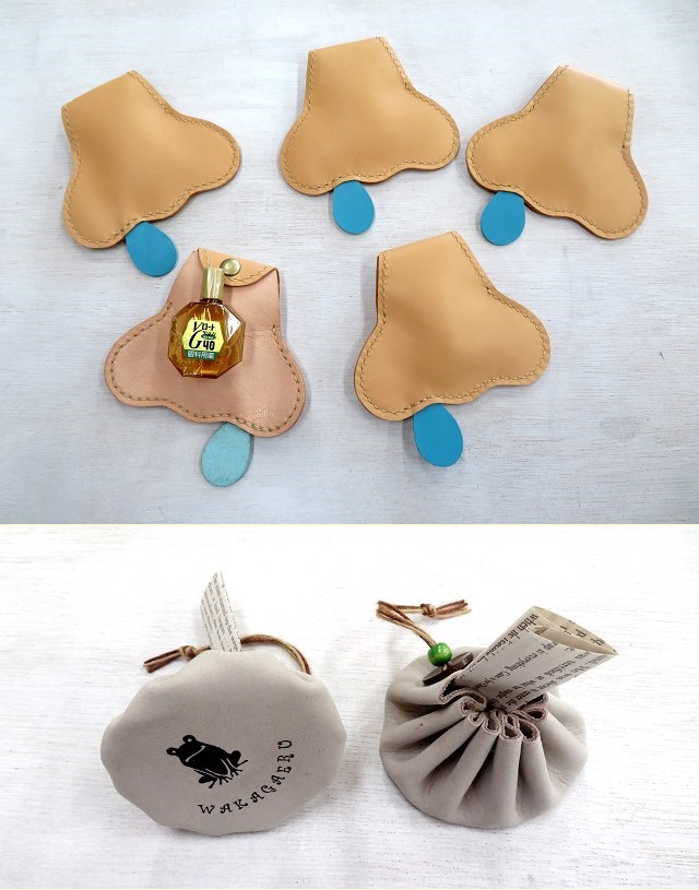 画像上は、ヌメ革製の鼻の形の目薬ケース。